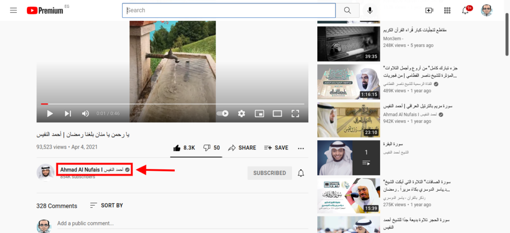 والذي يمكن الحصول عليه من رابط القناة أسفل اي فيديو من فيديوهات القناة المطلوب اضافتها، كما هو مُشار إليه في الصورة التالية: